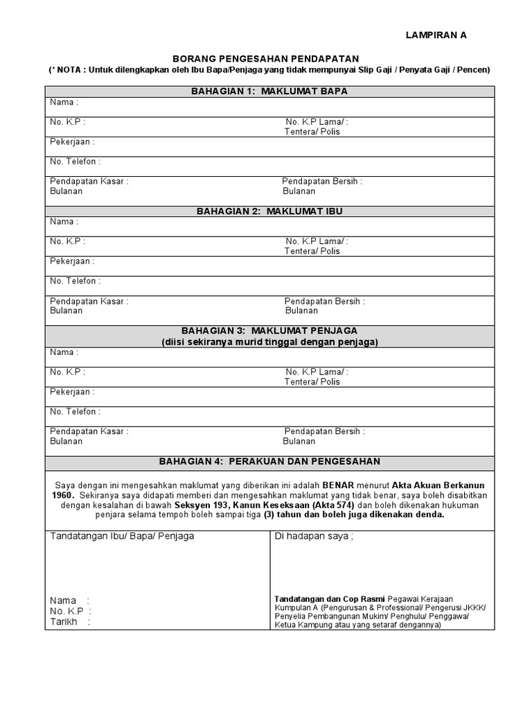 Lampiran A Borang Pengesahan Pendapatan Pdf
